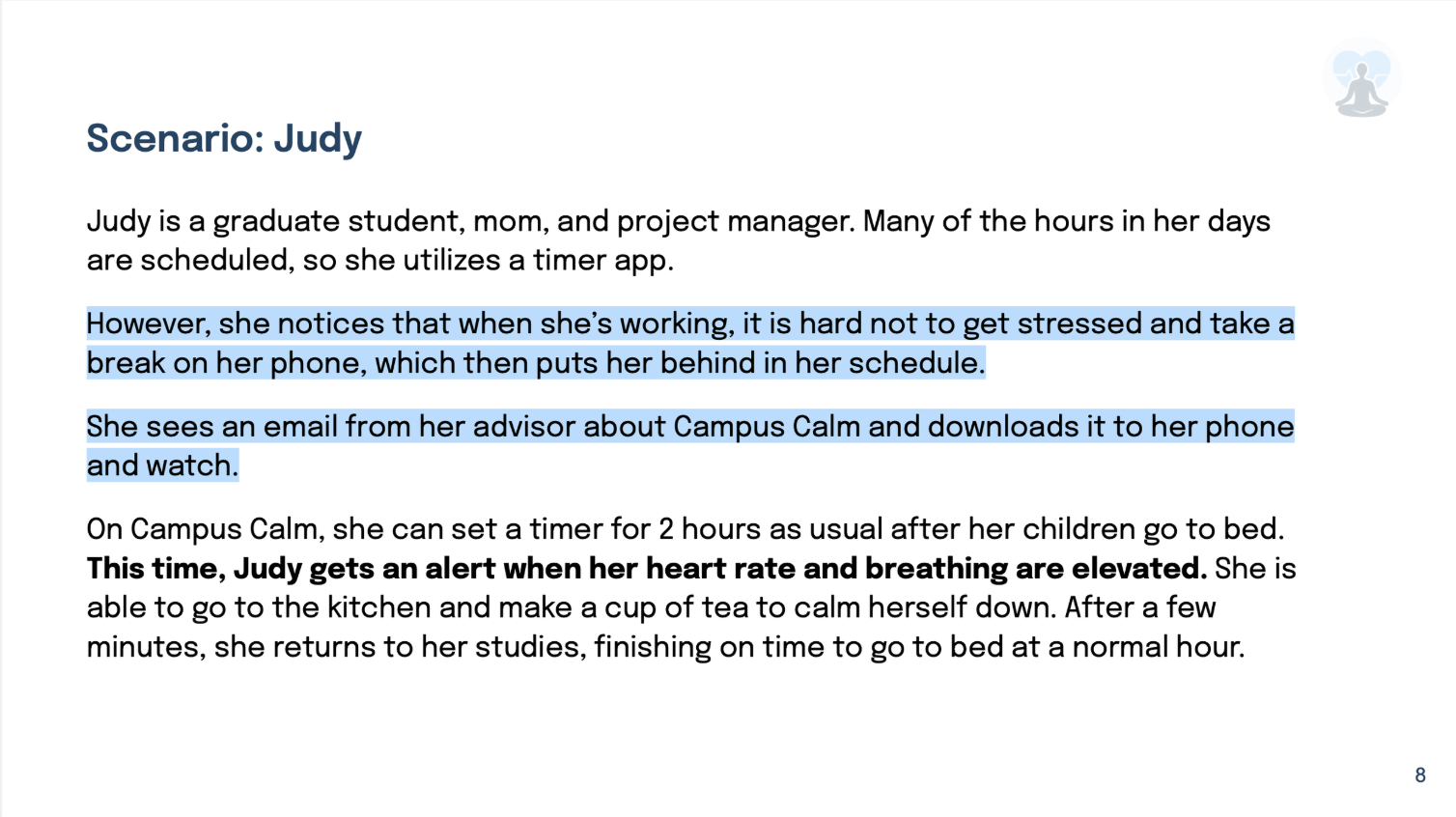 I designed Campus Calm, a dual-channel wellness app focusing on stress management for students, in collaboration with Lauren Johnson for HCI 430: Prototyping and Implementation at DePaul University. Utilizing smartwatch health data such as temperature and heart rate, Campus Calm monitors stress during study sessions while encouraging healthy breaks like meditation in order to decrease chronic stress.
